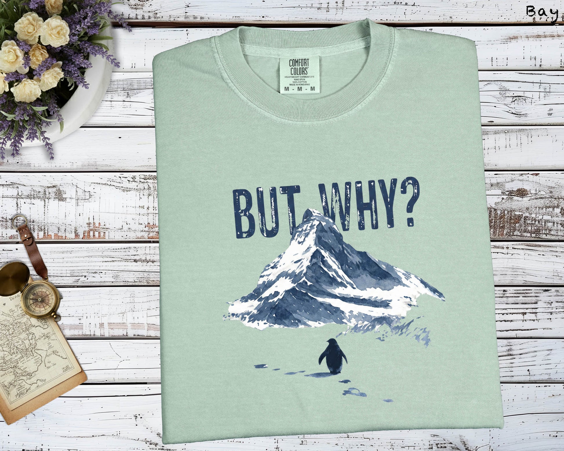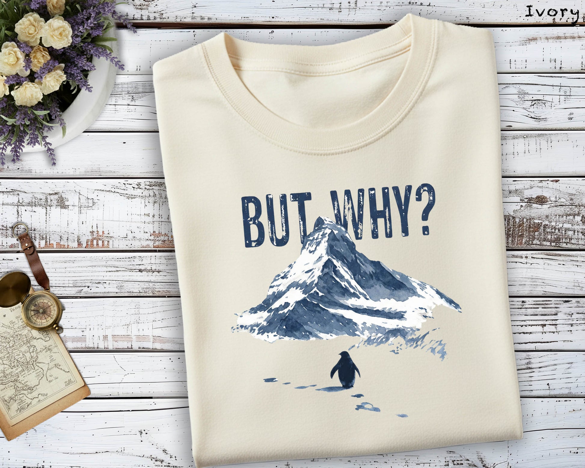 But Why Penguin Mountain T-Shirt, Emotional Themed Graphic Tee, Unisex Artistic Top