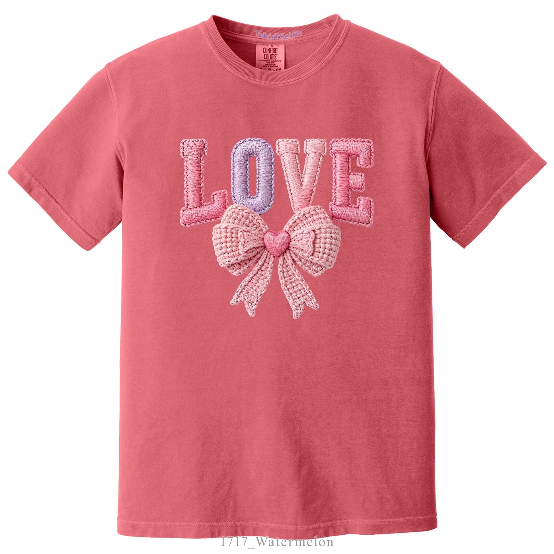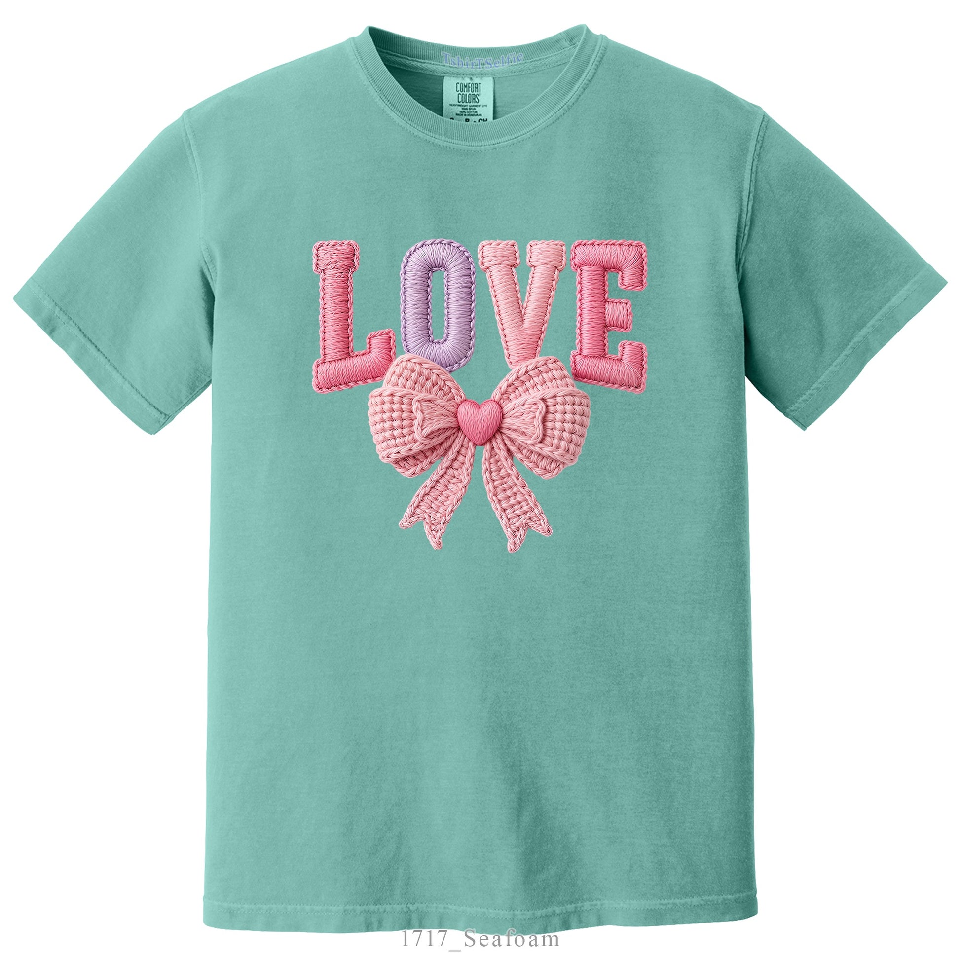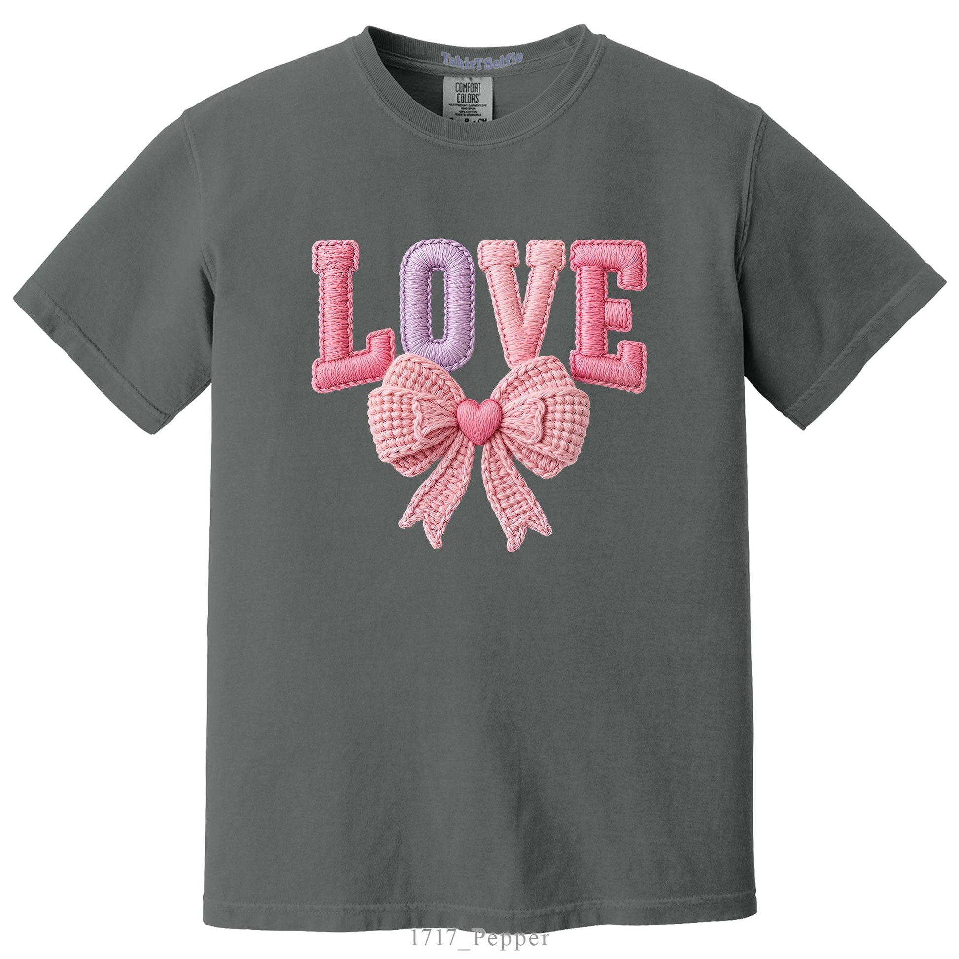 Tags: #EmbroideryLookTee #BowDesignShirt #LoveLetteredTshirt #RomanticFashion #DTFPrinting #PastelApparel #WomensGraphicTee #LoveThemedFashion #3DEffectPrint #GiftForHer